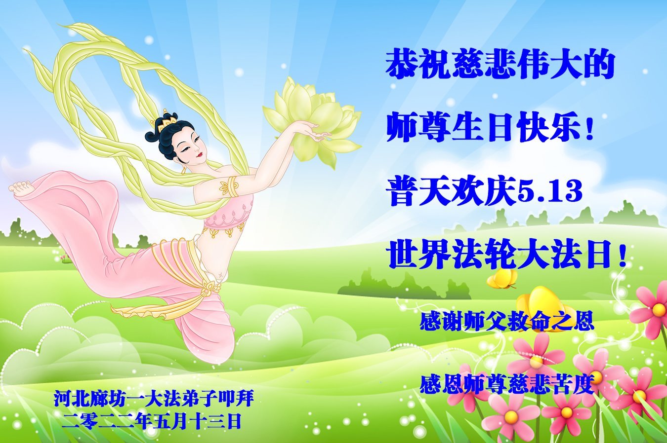 河北廊坊一大法弟子叩拜 二零二二年五月十三日 河北廊坊北旺乡大法弟子恭祝师父生日快乐!庆祝世界法轮大法日!