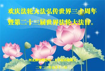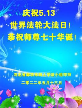 二十三年的世界法轮大法日 我期盼师尊早日来中国大陆 期盼世界神韵能来大陆演出 在师尊七十华诞的美好日子 弟子恭祝伟大师尊生日快乐! 感谢师尊对弟子的时时保护 感恩师尊给弟子的慈悲苦度 河北省廊坊市管道局一大法弟子叩拜 二零二二年五月十三日 河北廊坊一大法弟子恭祝慈悲伟大的师尊生日快乐!庆祝世界法轮大法日!