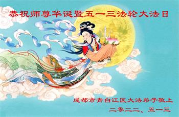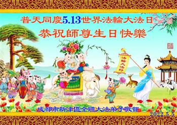【明慧网二零二二年五月十三日】 四川省成都市青白江区一大法弟子恭祝慈悲伟大的师尊华诞暨世界法轮大法日!