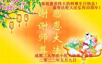 四川省成都二人学法小组大法弟子恭祝慈悲伟大的师尊生日快乐!