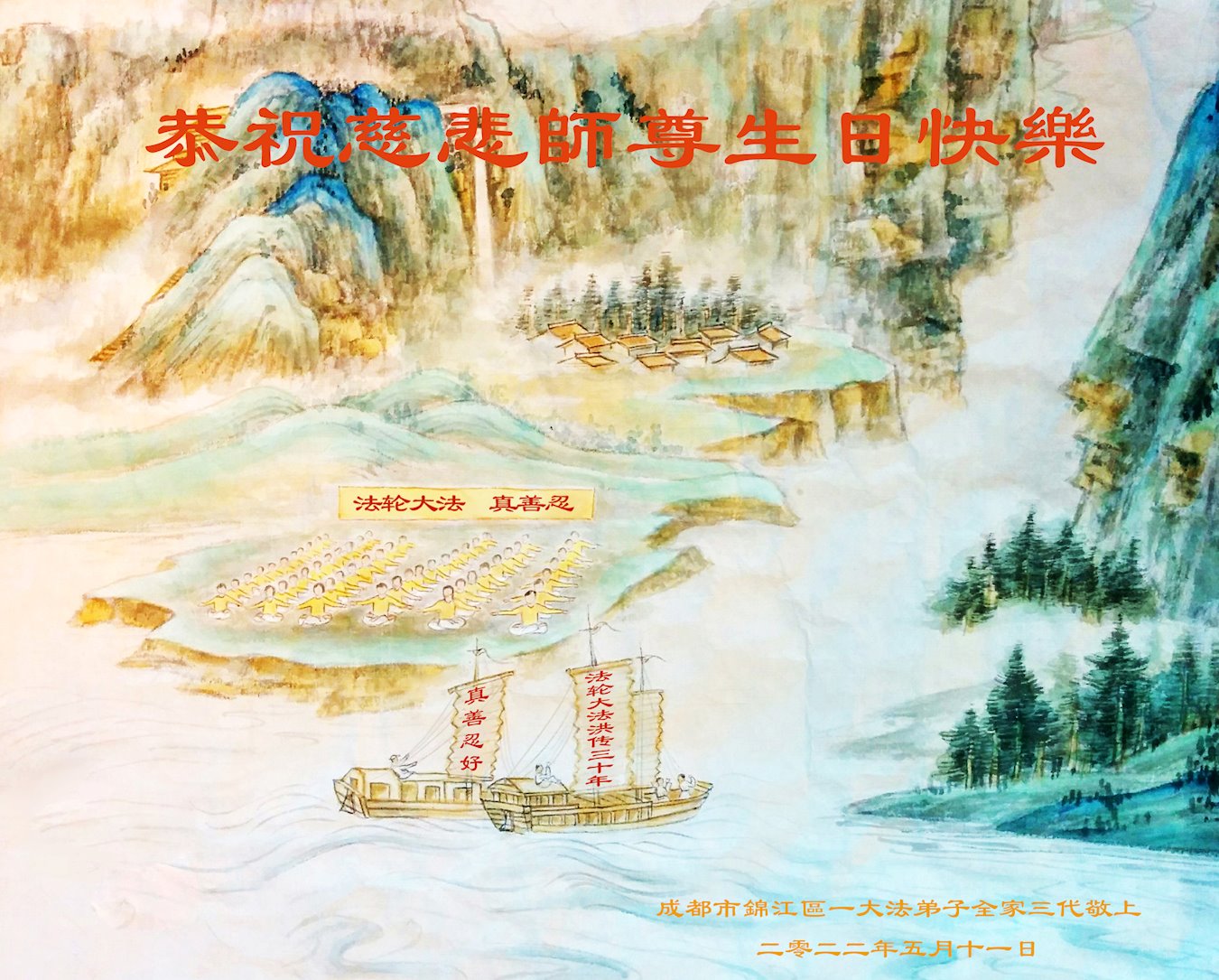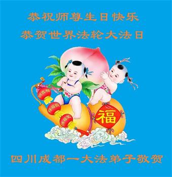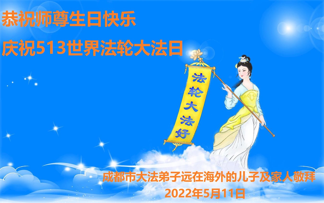 庆祝世界法轮大法日! 恭祝师尊生日快乐!庆祝世界法轮大法日! 成都市大法弟子远在海外儿子及家人敬拜 四川成都一大法弟子恭祝师尊生日快乐!恭贺世界法轮大法日!