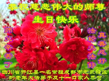 四川省开江县一名常驻成都市龙泉驿区的老年大法弟子及11口家人恭祝慈悲伟大的师尊生日快乐! 四川省成都市新津区全体大法弟子恭贺师尊华诞暨世界法轮大法日!