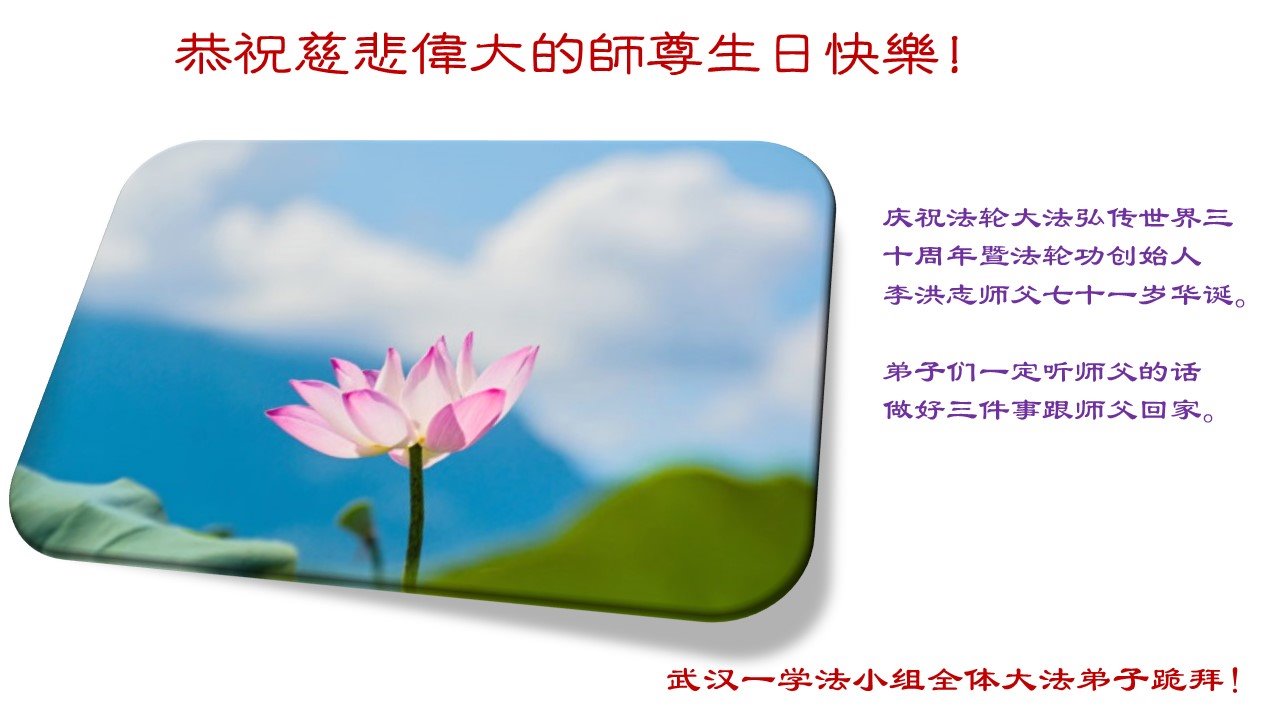 湖北省武汉一学法小组全体大法弟子恭祝慈悲伟大的师尊生日快乐!