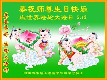 河南省平顶山市一学法小组大法弟子恭贺世界法轮大法日!恭贺法轮大法洪传三十周年!恭祝师尊生日快乐!