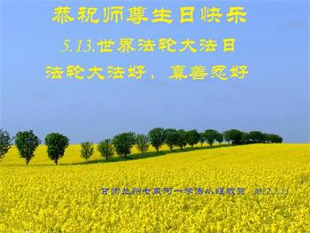 恭祝师父生日快乐! 欢庆5·13世界法轮大法日! 欢庆法轮大法洪传世界三十周年! 慈悲伟大的师父: 您好!您辛苦了! 弟子想念您!多想早日见到师父! 多少次的轮回转世中,在无明的迷中,在末劫乱世中,我们造了无尽的罪业。 在面临毁灭的危急关头,是慈悲的师父,把业力满身的我们从地狱中捞起洗净,引领我们走上正法修炼、返本归真的路。 我们深深的知道,作为一个生命,能成为您的弟子,能成为“正法时期大法弟子”是多么的荣幸!是多么难得的圣缘!我们会珍惜这份来之不易的缘份。 修炼中的人心干扰、尘世的种种诱惑、邪恶的疯狂迫害,我们走的磕磕绊绊,跟头把式的。 但是我们心中有法,有师父的保护,有助师正法、坚修到底、不辱使命的坚强决心和勇气,一定要走好走正最后阶段修炼的路。 在所剩不多、弥足珍贵的日子里,我们不辜负师父的期望、众生的期盼。向内找,实修自己,做好三件事,破除变异的现代观念,破除无神论、进化论邪说,兑现来世的誓约,跟师父回家。 感恩师父!跪拜师父! 甘肃省白银市景泰县大法弟子敬贺 二零二二年五月十一日 甘肃省白银市会宁县大法弟子携家人恭祝世界法轮大法日!