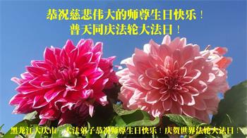值此法轮大法日到来之际,恭祝师尊生日快乐!并向师尊叩首。我们一家感恩师尊救度,非常想念师尊,盼望师尊回大陆。弟子按师尊的教诲,走好最后的路。 弟子合十 黑龙江大庆肇源县大法弟子恭贺法轮大法日!