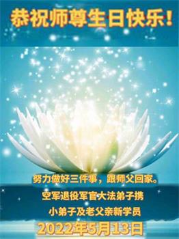 【明慧网二零二二年五月十三日】 河北、北京住北京空军某家属大院祖、孙俩大法弟子恭祝师父生日好!普天同庆世界法轮大法日!