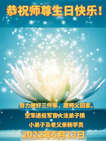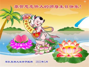 恭祝慈悲伟大的师尊生日快乐!师尊辛苦了! 重庆部队学法小组大法弟子敬上 二零二二年五月 武警部队复退转业的大法弟子恭祝慈悲伟大的师尊生日快乐!恭贺世界法轮大法日!