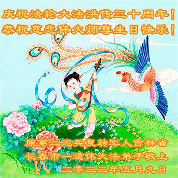 原第二炮兵复转军人和吉林省长春市一退休大法弟子庆祝法轮大法洪传世界三十周年!恭祝慈悲伟大的师尊生日快乐!