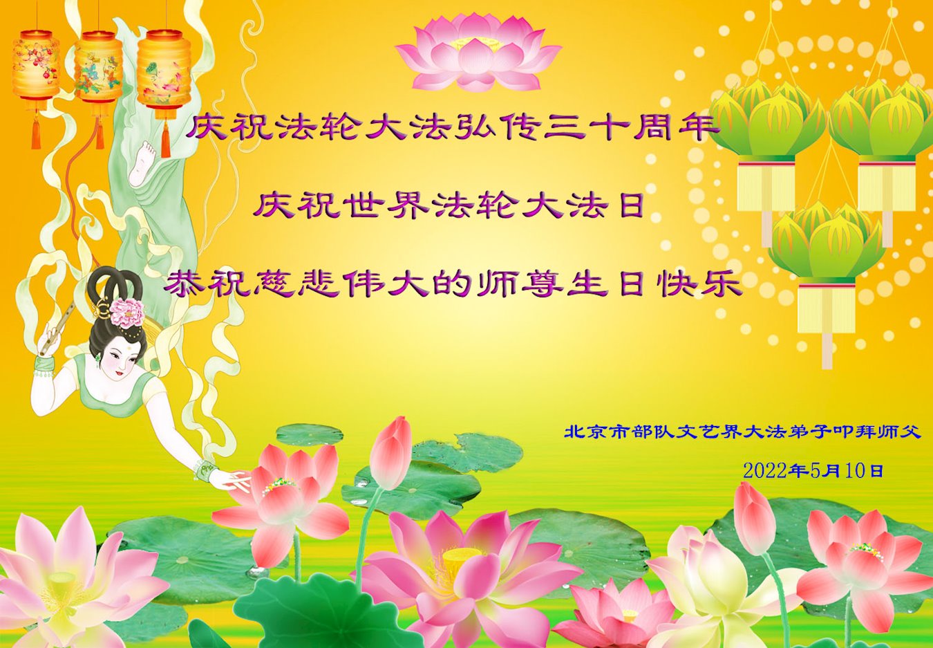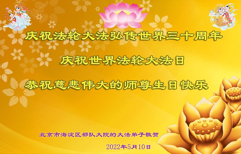 北京海淀区部队大院的大法弟子敬贺法轮大法日!恭祝师父生日快乐! 我们有幸得我们伟大的师父伟大的大法救度,真是无比幸福!无比自豪!我们无限感恩师父!今后无论多么艰难困苦,决心更严格修好自己,助师正法,坚定的走好最后的正法修炼之路!跟师父回家! 北京市海淀区部队大院的大法弟子敬贺 2022年5月10日 北京市部队文艺界大法弟子恭贺法轮大法日
