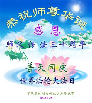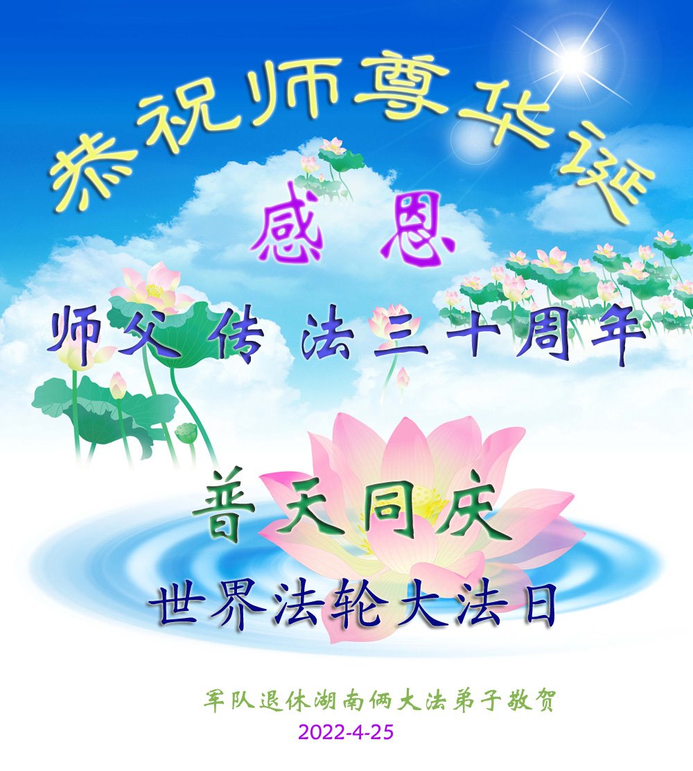 湖南两位军队退休大法弟子恭祝师尊华诞暨师父传法三十周年!