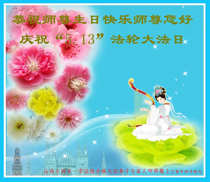 五月花开的季节, 挚爱的季节, 感恩的季节, 正值繁花似锦, 绿荫如海之际, 临近世界法轮大法日, 在这美好的日子里, 我们向师父献上最诚挚的生日问候, 祝师尊生日快乐! 我们全体大法弟子表示一定不辜负师父的期望,做好三件事,走好走正师父安排的修炼道路,无论遇到什么艰难险阻,都挡不住我们正法修炼路上的脚步。 山西省汾西县全体大法弟子叩拜师父 山西省大同市平城区一大法弟子全家恭祝慈悲伟大的师尊生日快乐!恭贺五·一三世界法轮大法日!恭贺法轮大法洪传三十周年!