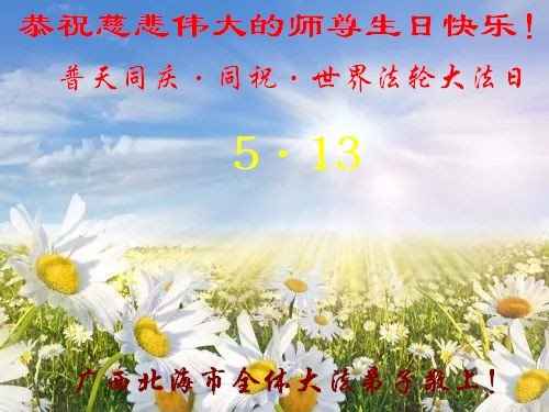 广西北海市全体大法弟子庆祝世界法轮大法日!恭祝师父生日快乐!