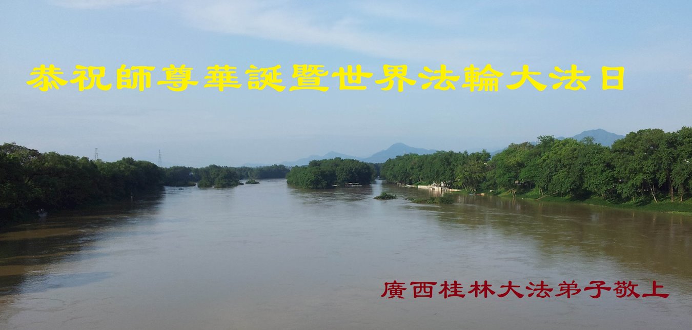 大法弟子敬师尊 普天同庆大法日 天地复明处处春 成住坏灭出疫瘟 愁煞迷中世间人 退出恶党明真相 真善忍是救命根 广西桂林市全体大法弟子恭祝师尊生日快乐!