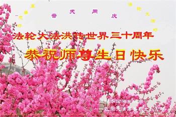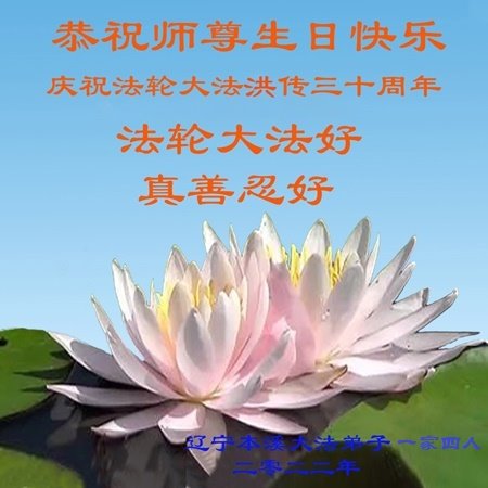 庆祝“513”世界法轮大法日! 普天同庆、三喜临门!三十年转眼一瞬间。师父带领我们走向光明、走向修炼圆满。在这三十年里我们亲身经历了艰辛、艰苦、坚韧、以及惊心动魄、血雨腥风而又坎坎坷坷的修炼路程。在修炼中、在助师正法中、在救人中,我们闯过一关又一关。跌倒了、爬起来。摔跟头、站起来。在生命最危险的时刻,师父为我们化险为夷,时时刻刻保护着我们。师父就在我们身边。我们生生世世寻找的师父,我们生生世世等待恩师。用任何语言都无法表达对师父的感恩。千言万语汇成一句话:听师父的话、做好三件事。多救人,修好自己。 辽宁本溪南芬区全体大法弟子敬上 辽宁省本溪市一家五口大法弟子恭祝师尊生日快乐!恭贺世界法轮大法日!