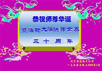 【明慧网二零二二年五月十三日】 辽宁本溪小市一夫妻大法弟子恭贺世界法轮大法日!普天同庆法轮大法洪传三十周年!