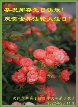恭贺法轮大法洪传三十周年! 恭贺五·一三世界法轮大法日! 谢谢慈悲伟大师尊的慈悲苦度!弟子要多学法,学好法。努力跟上正法進程,跟师父回家。 弟子叩拜慈悲伟大师尊! 沈阳市苏家屯区一老年大法弟子敬贺 二零二二年五月九日 辽宁省沈阳市苏家屯地区一大法弟子恭祝慈悲伟大师尊生日快乐!