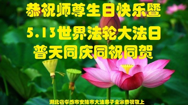 师尊为弟子承受了很多,弟子要努力精進,听师父的话,在最后的时间里,继续精進实修,做一名合格的大法弟子。 湖北省孝感市安陆市大法弟子全家恭祝师尊生日快乐!恭贺世界法轮大法日!