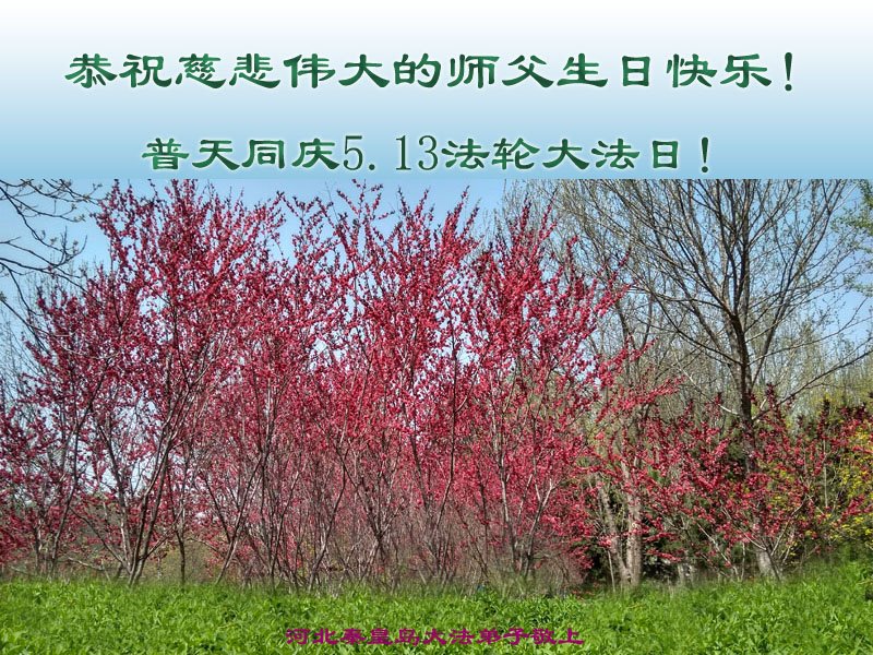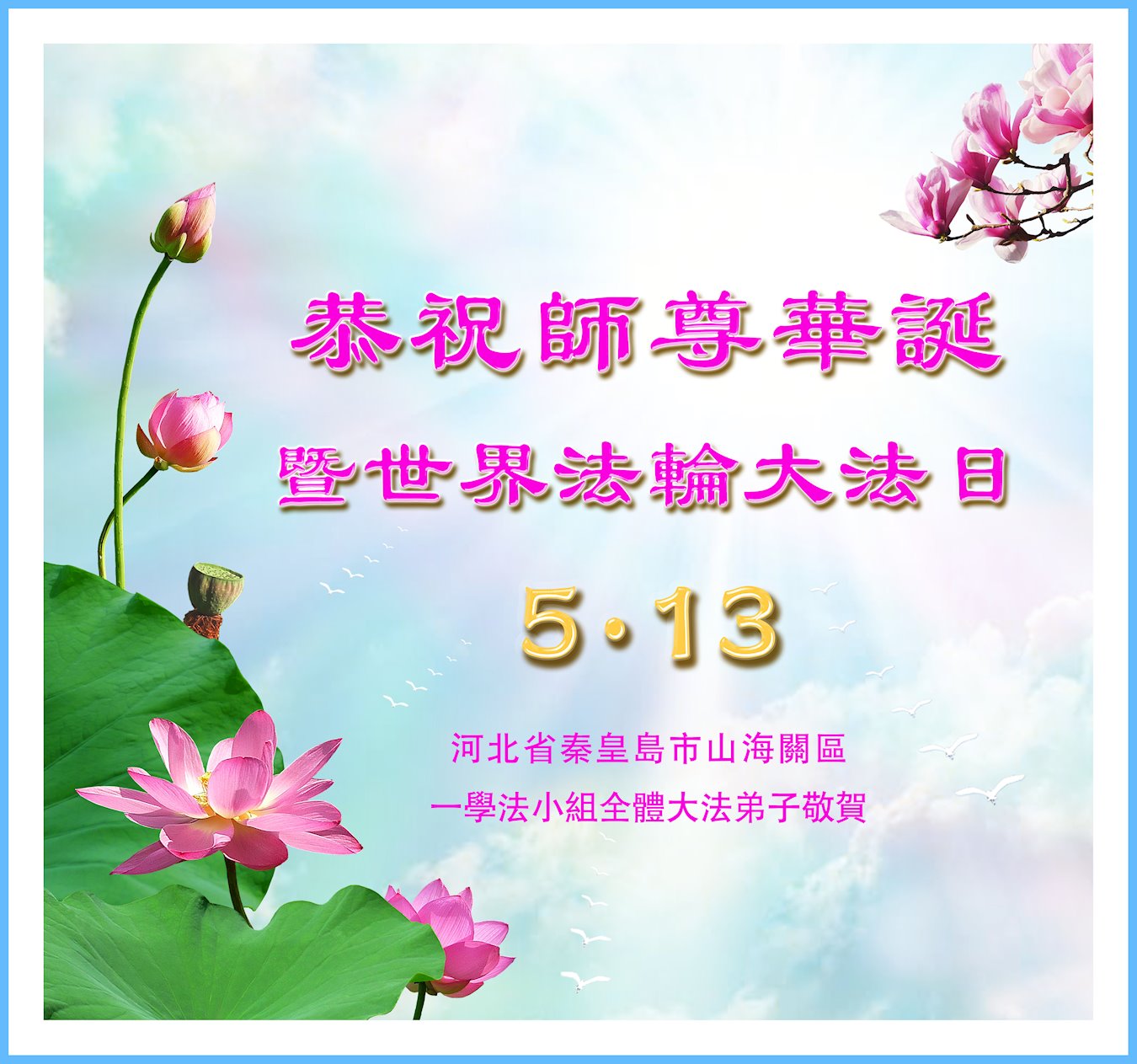 是师尊把弟子们从地狱中捞起、洗净赋予新的生命,亲传大法,使众多迷失了本性的生命有了新的希望,纷纷走入大法修炼,使社会人心向善,道德回升,修成先他后我,无私无我的高深境界,无不感师尊的救度之恩,在面对邪恶疯狂打压迫害时,内心深处也无时无刻为此生幸遇师尊并亲传大法感到快乐与自豪,没有内心的烦恼与身体上的痛苦,没有常人中的怨恨,有的只是对师尊的坚信与对法的坚定,让更多的有缘人了解真相走入大法修炼,沐浴在师尊无比庄严神圣,无比殊胜祥和与慈悲的法光里迈向自己的未来,共同庆祝伟大的师尊生日,5·13世界法轮大法日这一展现辉煌,改变历史开创未来,载入史册的特殊日子。 河北省秦皇岛一学法小组大法弟子恭祝慈悲伟大的师父生日快乐!恭贺法轮大法日!