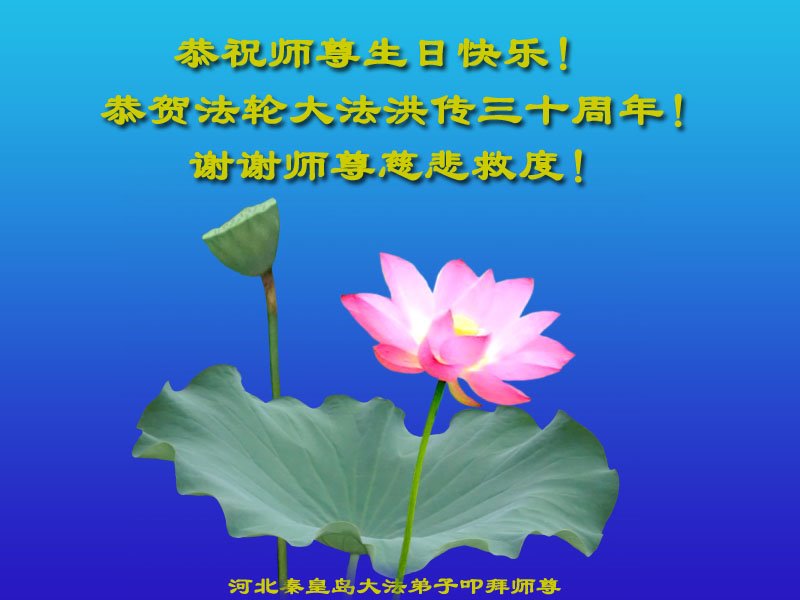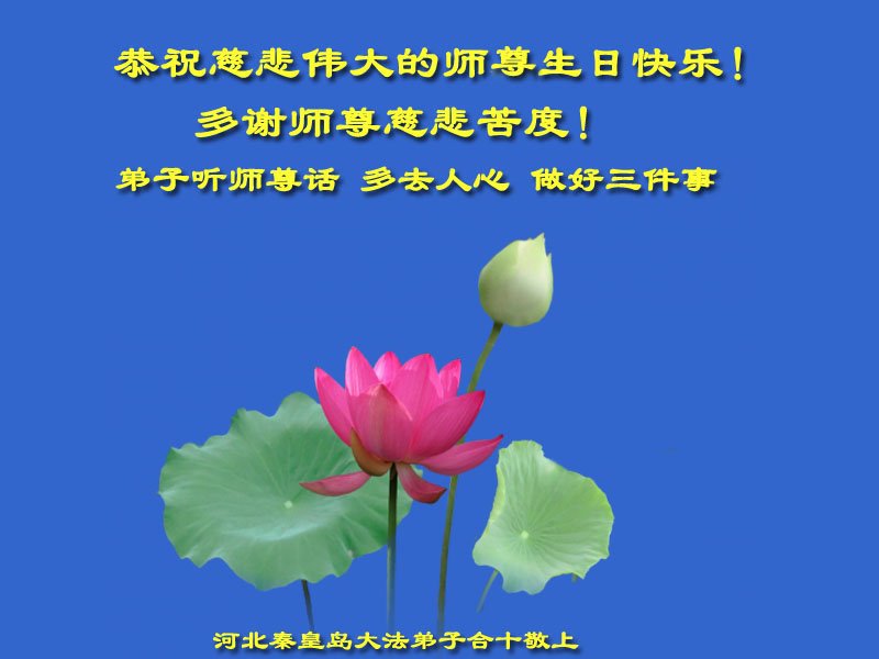 师父:弟子一路走到今天,每一步也离不开师父的保护,弟子一定精進实修,走好师父安排的路,做好三件事,精進再精進,不让师父操心。祝师父生日快乐! 合十 河北省秦皇岛市大法弟子恭贺师尊华诞暨法轮大法日!