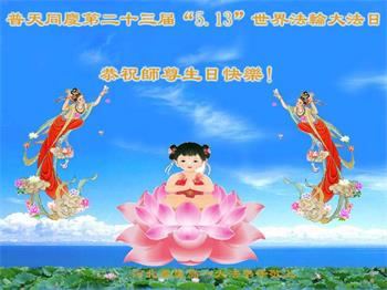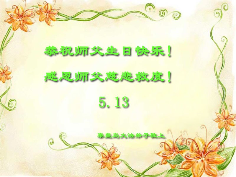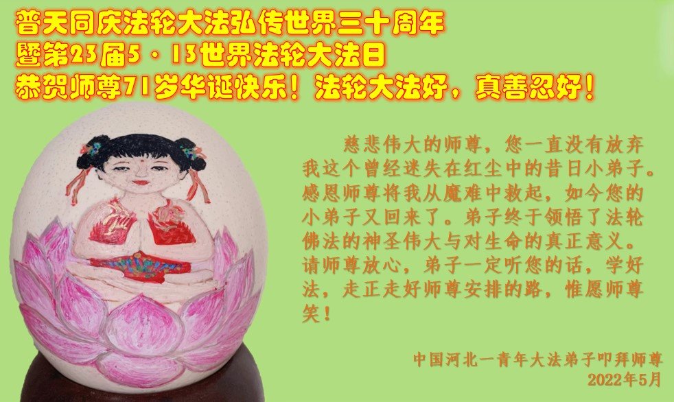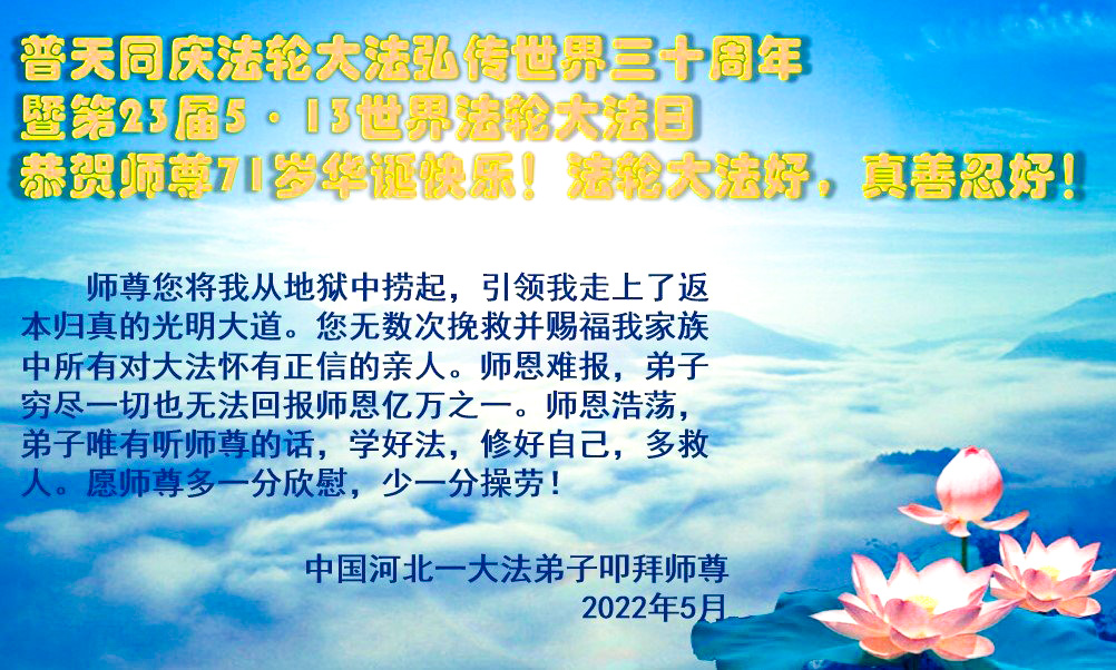 【明慧网二零二二年五月十三日】 河北省秦皇岛市一大法弟子家属恭祝师尊生日快乐!恭贺世界法轮大法日!