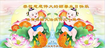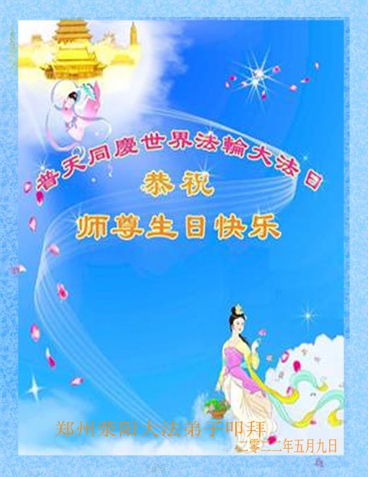 在世界庆祝二十三届法轮大法日即将到来的时刻,我们同时也迎来了慈悲伟大的师尊七十一华诞。作为身在国内的大法弟子,也多么的盼望能在大陆内举办大型的活动,来歌颂师尊的慈悲,大法的恩典。 在邪恶打压的国内,在疫情封城的今天,我们仅仅只能用这小小的贺卡来诉说大法弟子对师尊的无限感恩和无限的敬仰之心,也只能用我们手中的键盘敲打出我们埋藏在心中对师尊永远的祝愿:祝愿师尊生日快乐!师尊辛苦了! 河南省郑州市荥阳市大法弟子恭祝师尊生日快乐!恭贺世界法轮大法日!