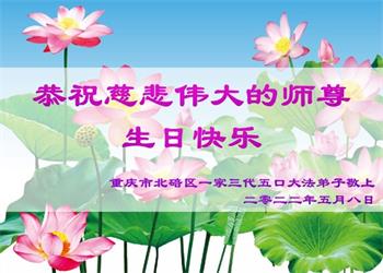 重庆市渝中区一家三位大法弟子恭祝慈悲伟大的师父七十一华诞!恭祝5.13法轮大法日及法轮大法洪传世界三十周年!
