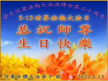 | 【明慧网二零二二年五月十三日】(明慧网通讯员综合报道)法轮大法弘传世界三十年,真、善、忍的光芒普照大地,给世界各族裔亿万民众带来道德的回升、身心的健康、家庭与社会的福祉。世界法轮大法日“五·一三”到来之际,全世界大法弟子同庆同贺这一众生得救的伟大的节日!恭贺师尊华诞! 明慧网收到来自52国和地区的大法弟子精心制作的贺卡与贺信,以下为其中部份贺信,分别来自:中国、美国、法国、克罗地亚、西班牙、加拿大、日本、韩国、越南、台湾、香港、澳门、奥地利、苏格兰、加蓬、泰国、印度、阿富汗、阿联酋、澳大利亚、新西兰、德国、波黑、爱尔兰、瑞士、比利时、南非、伊朗、以色列、厄瓜多尔、意大利、瑞典、巴西、南美玻利维亚、智利、俄罗斯、芬兰、荷兰、马来西亚、印度尼西亚、新加坡、捷克、斯洛伐克、保加利亚、白俄罗斯、乌克兰、克里米亚、丹麦、挪威、希腊、葡萄牙、菲律宾等国家和地区。 法国全体大法弟子恭贺法轮大法洪传世界三十周年暨师尊华诞!