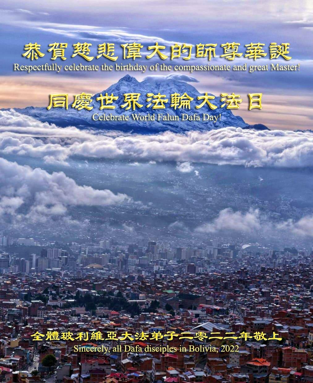 南美玻利维亚全体大法弟子恭祝慈悲伟大的师尊华诞!同庆世界法轮大法日!
