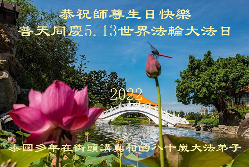 来到南非快半年了,身边没有同修的环境,心里好像没有了修炼的依靠,但一想起师尊和大法,感觉师父就在我眼前,因为我有无所不能的师父啊,我什么困难都克服的了。 我得珍惜万古机缘,得做好三件事,学好法,实修自己,多多救人,完成历史的使命跟师父回家。感恩师尊的慈悲苦度!叩拜师尊! 弟子双手合十 泰国八十多岁一直坚持在街头讲真相的大法弟子恭祝师尊生日快乐!普天同庆世界法轮大法日!