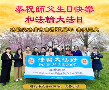 美国纽约法拉盛一洪法、征签小组大法弟子恭祝师父生日快乐!恭贺世界法轮大法日!