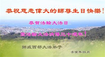挪威西部大法弟子恭祝慈悲伟大的师尊生日快乐!庆祝法轮大法洪传三十周年!