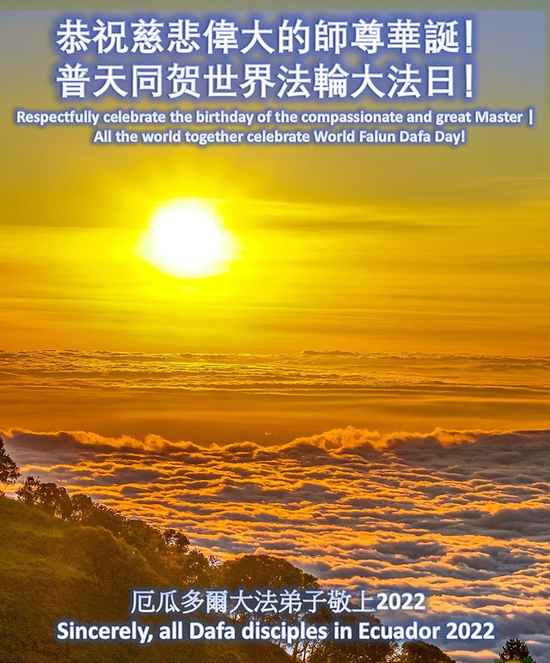 敬爱的师父,我们是纽约真相点的义工,首先恭祝师父生日快乐! 平时我们发资料,劝中国人三:退.,也向纽约市民讲真相并征签。感恩师父慈悲苦度!为众生承担无量罪业,救度众生于危难,作为师尊的弟子,大法的粒子,这是我们无尚的荣光。 我们在修炼实践中,受益无穷,不仅有了健康的身体和幸福的心境,生命境界不断升华,师父带领我们走在回家的路上。我们一定要把“法轮大法好”、“真善忍好”的福音广传,让更多人明白真相,不负师父的洪恩浩荡。 厄瓜多尔大法弟子恭祝师尊华诞!普天同贺世界法轮大法日!