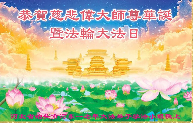 河北省泊头市河东一老年大法弟子学法小组大法弟子恭祝伟大的师父生日快乐!恭贺法轮大法洪传三十周年!共同祝贺世界法轮大法日!弟子们感恩师尊无量慈悲!弟子们不负师恩,做好三件事,修好自己,助师正法,多多救人。请师父放心。 叩谢师尊救度洪恩! 河北承德一明真相敬老院院长祝师父生日快乐!