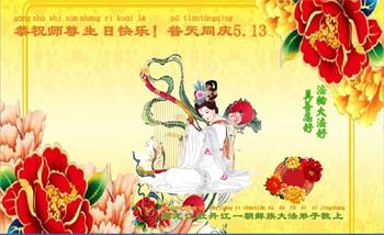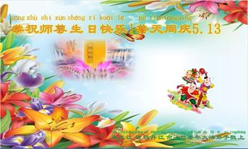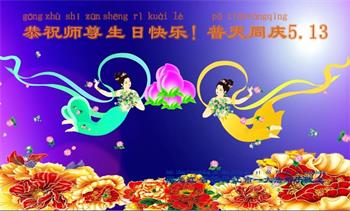 谨在5.13世界法轮大法日和师父华诞之际,恭祝师尊生日快乐!弟子们想念师尊,唯有真修,实修,做好三件事,才是真正的助师正法,真善忍好,法轮大法好! 黑龙江省双鸭山一大法弟子恭祝师尊华诞快乐!恭贺五·一三世界法轮大法日!