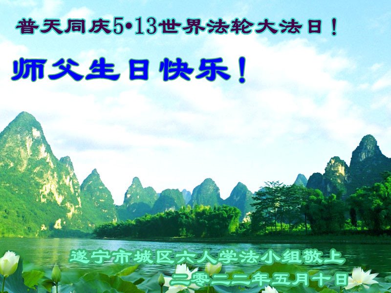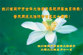 恭祝师尊生日快乐!庆祝5.13法轮大法三十周年! 遂宁城东学法小组感恩师尊慈悲救度。师尊洪传宇宙大法,救度所有众生。为救众生所经历和承受的,谁能用语言说清。师尊保护弟子走过了每一关、每一难,弟子感恩师尊无尽语言。只有做好三件事,多救众生,才不辜负师尊慈悲救度之恩。 遂宁市城东学法小组敬上 二零二二年五月十日 四川省南充全体大法弟子恭祝慈悲伟大的恩师生日快乐!