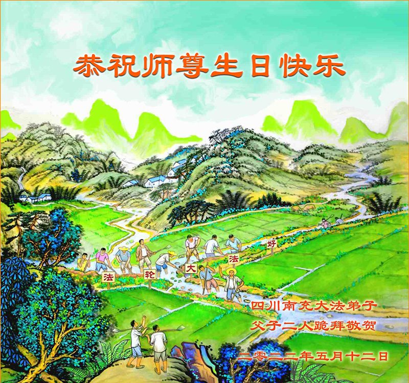 四川南充大法弟子父子二人恭祝师尊生日快乐!同贺法轮大法日!