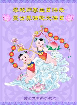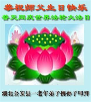 在这普天同庆的喜庆日子里,弟子恭祝慈悲伟大的师父生日快乐!弟子感恩师父的慈悲保护,弟子一定要做好三件事、精進实修、抓紧时间救度世人。 祝贺世界法轮大法日! 湖北武汉一老年大法弟子恭祝师尊生日快乐!