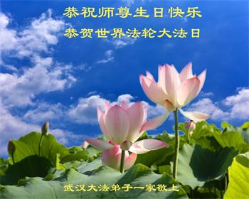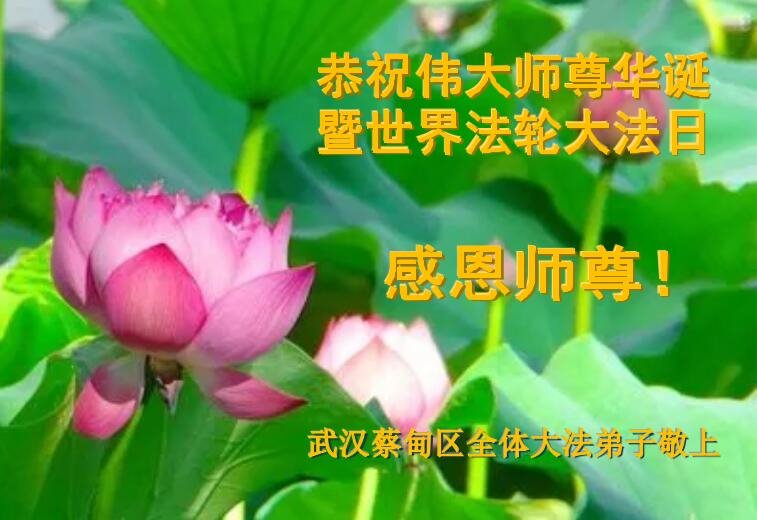 值此世界法轮大法日到来之际,恭祝师尊生日快乐!并向师尊叩拜!大法弟子非常想念师尊,衷心感谢慈悲伟大的师尊!并按师尊的教诲,走好最后的路。 武汉医疗系统大法弟子一家人敬上 湖北省武汉市蔡甸区大法弟子恭祝师尊生日快乐!普天同庆世界法轮大法日!