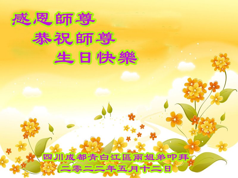 在这普天同庆世界法轮大法日、法轮大法洪传三十周年的日子里,恭祝师尊生日快乐!弟子想念师尊。今生能成为师尊的弟子,感到无上荣幸,在正法的最后时期,抓紧时间做好三件事,圆满随师还。感恩师尊慈悲救度! 四川成都青白江区姐弟俩敬贺法轮大法日!恭祝师父生日快乐!