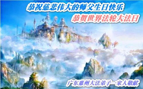 师尊传法三十载 慈悲众生救度来 法徒轮回为得法 历经魔难神路迈 师尊教诲记心怀 不断精進正念在 助师救度行使命 圆满回家师父安排 广东深圳西丽镇大法弟子全家恭贺世界法轮大法日!