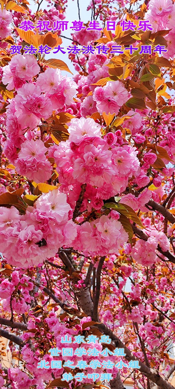 山东青岛世园会学法小组、北国之春学法小组大法弟子贺法轮大法洪传三十周年!恭祝伟大师尊生日快乐!