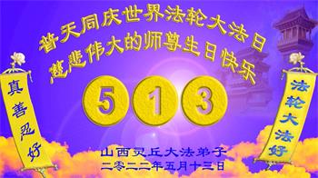 【明慧网二零二二年五月十三日】 山西省大同市五洲帝景全体大法弟子叩拜恭贺师尊华诞!敬贺世界法轮大法日!