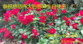 江苏苏洲太仓市老年学法小组大法弟子,我们都是七十五岁以上的大法弟子,能风风雨雨在这二十多年走过来,全是师父给我们的洪福。我们一定要保持修炼如初的劲头,认真做好三件事,随师法正人间。在此恭祝伟大的师父生日快乐! 江苏省南京市一大法弟子和女儿恭祝慈悲伟大的师尊生日快乐!