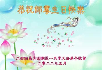 我们在喜迎法轮大法洪传三十周年之际,恭祝慈悲伟大的师父生日快乐!同时庆祝世界法轮大法日。 师父您辛苦了!弟子非常想念您! 江西省南昌市青云谱区一大法弟子 二零二二五月八日 江西省南昌市青山湖区俩大法弟子恭贺世界法轮大法日