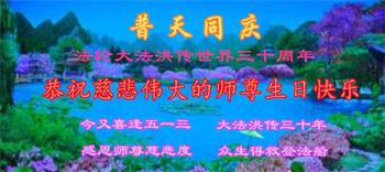 感恩师尊苦心慈悲救度,弟子们在压力下一定精進不怠,救人不停,让师尊放心。恭祝师尊生日快乐! 江西省九江市一学法小组大法弟子恭祝五·一三世界法轮大法日!恭祝慈悲伟大的师尊生日快乐!