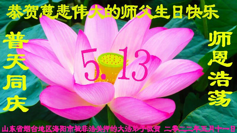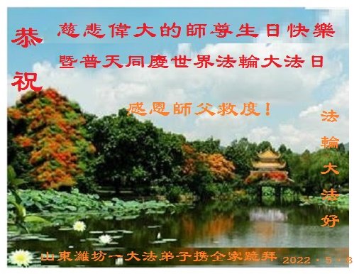 今年是法轮大法洪传世界三十周年,在这个普天同庆的伟大日子里,弟子更加想念慈悲伟大的师父!在中共残酷迫害大法和大法弟子的二十三年中,弟子被非法判刑七年,被病魔折磨瘫痪九年,在这血与火的熔炼中,是师父一次又一次的将弟子起死回生,师恩难报呀!弟子唯有在这最后的修炼时刻,不管怎么艰难,我都要义无反顾的坚定的跟随师父,走到正法的最后一刻,跟师父回家! 二零二二年五月八日 山东潍坊大法弟子携全家恭祝慈悲伟大的师尊生日快乐暨普天同庆世界法轮大法日!