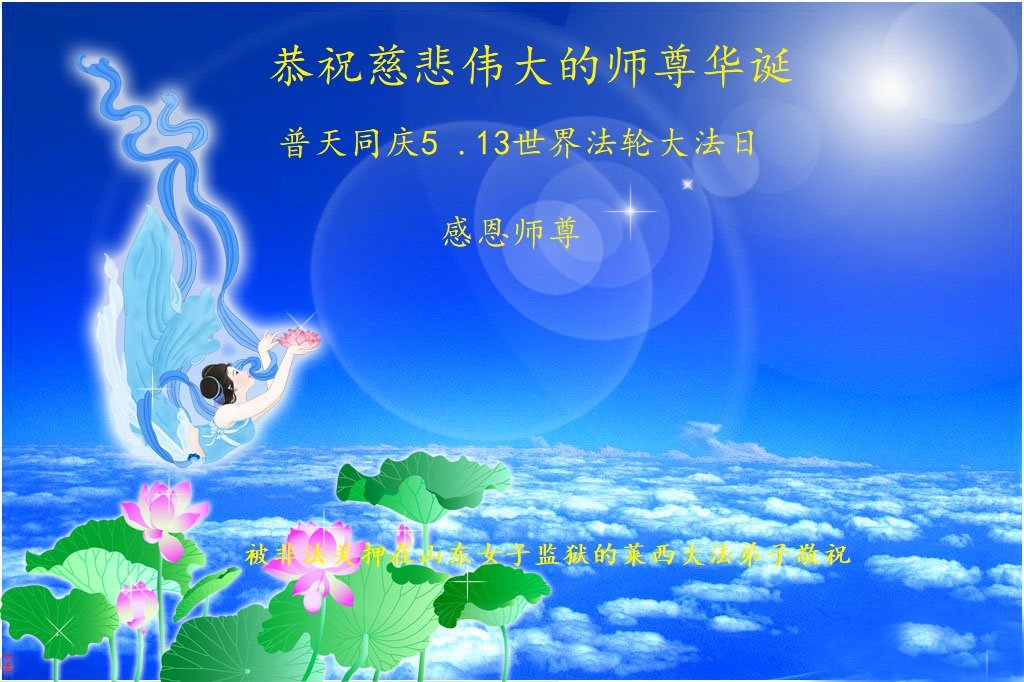 感恩师尊慈悲救度!弟子叩拜师尊!感谢师尊! 弟子被关押在狱中遭迫害期间,师父时时刻刻保护着弟子。有师父的法在,弟子能正念正行抵制迫害,坚强的走过来了。 被非法关押在山东省女子监狱的大法弟子恭贺5.13世界法轮大法日!