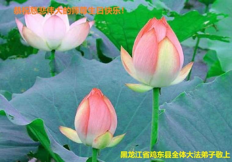 5.13是世界法轮大法日,也是伟大师尊的生日。在这喜庆的日子里,众神汇聚,普天同庆、同祝、同颂师尊的无量慈悲与浩荡洪恩!我们鸡东地区大法弟子,心中充满了幸福和喜悦!恭祝师父生日快乐!师父辛苦了! 我们能在如此邪恶的迫害中走到今天,时时刻刻都溶着师尊的心血与付出。千言万语难以表达对恩师的感谢!留给我们的时间真的不多了,我们要万分珍惜:不忘使命,助师正法。精進实修,做好“三件事”,救度众生。不负“正法时期大法弟子”的伟大称号、不负师尊的殷切希望,不让期盼得度的众生失望。同化大法,修好自己,尽力救下更多的世人,少留遗憾。让师尊多一份欣慰,少一份操劳!惟愿师尊笑! 黑龙江省鸡西市一资料点大法弟子恭祝慈悲伟大的师尊生日快乐!
