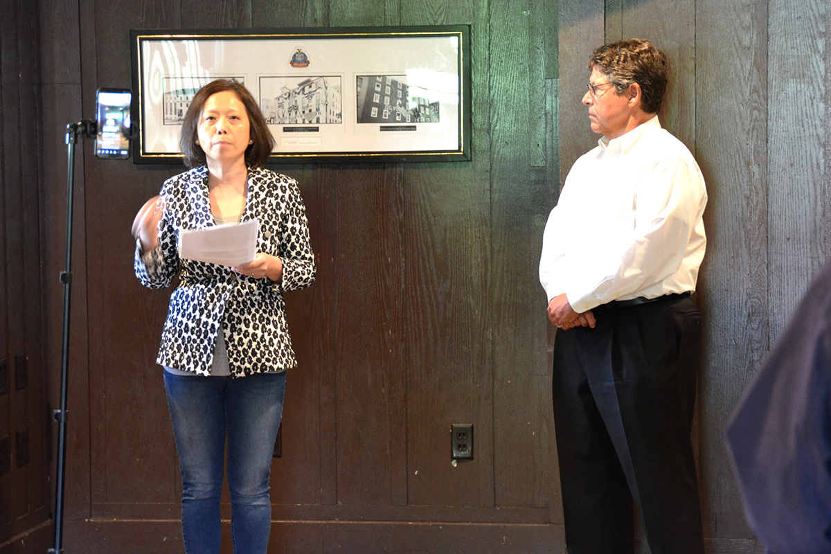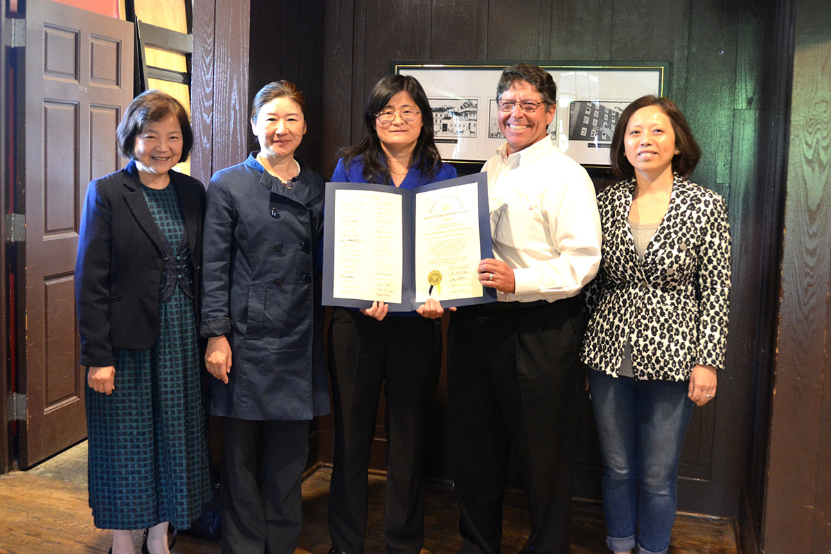 褒奖由德拉华州三位众议员鲍姆巴赫、德布拉·赫弗南(Debra Heffernan)和凯文·亨斯利(Kevin S Hensley)共同发起,众议院议长彼得·施瓦茨科普夫(Peter C. Schwartzkopf)以及全体四十一位众议员都签了字。 众议院的褒奖说:“一九九二年,李洪志先生在中国首次公开传授法轮大法。从那时起,法轮大法已经闻名于世。法轮大法由修心、打坐和四套动功组成,能改善人的身心健康,使人精力充沛。修炼的核心准则是真、善、忍……这个功法确实改善了无数人的生活。” 众议院还“衷心恭贺法轮大法继续取得成功!” 颁发褒奖后,法轮功学员刘女士向现场民众介绍了修炼法轮功后自己和家人在身心上的巨大收获:自己多年的各种疾病不治而愈;作为一家全球科技巨头公司的高级技术负责人,她能够从容面对每天的各种压力;从小就修炼法轮功的女儿能够以真、善、忍的标准要求自己,处理好学业和生活上的挑战,在高四时她带领校游泳队取得了美东私校冠军赛的冠军,现在是一所名校的学生运动员,并加入了美国陆军后备军官训练计划。 刘女士的分享激发了现场听众的兴趣,有人表示将告诉家人法轮功的信息,希望能够修炼。法轮功学员还在现场向民众分发漂亮的手折莲花和法轮功信息传单。  图4:颁奖仪式后,法轮功学员刘女士向现场民众介绍了修炼法轮功后自己和家人在身心上的巨大收获。 |